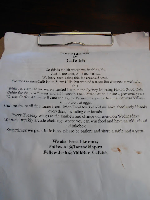 While some may find the environment quite hectic, the waitress's bubbly and energetic character exudes an endearing and humorous warmth to the diner; single handedly capable of running the front house dashing from one end to the other gracefully. Milk Bar by Cafe Ish is the modern day milk bar gen Y never had. All that's missing is the Marilyn Monroe look alike and a 50s Sinatra soundtrack playing loudly but I guess that's what the juke box is for. Until next time.